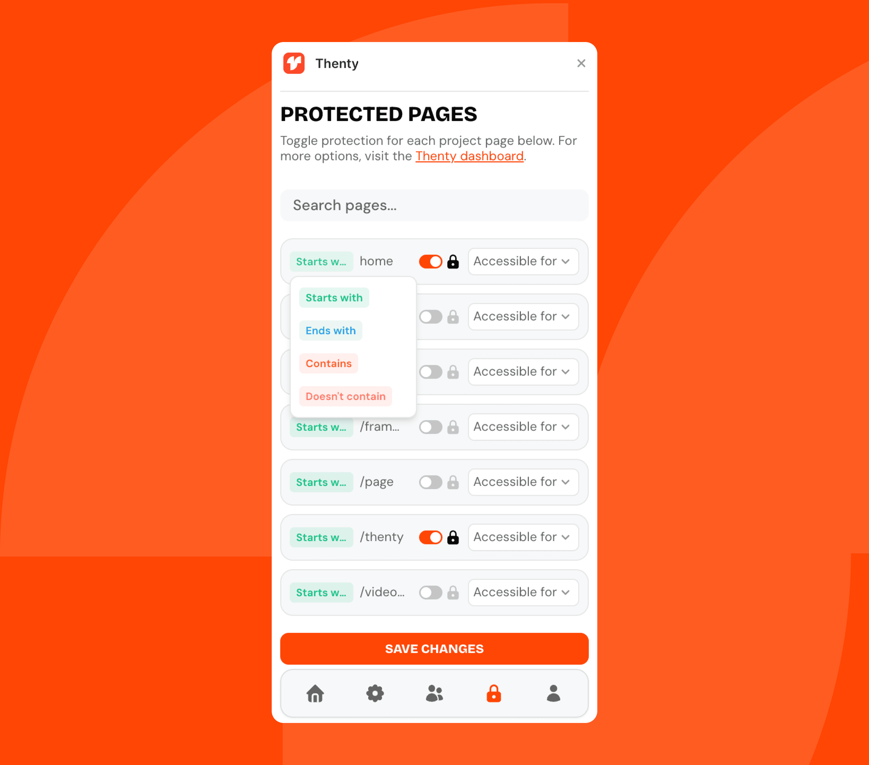 Once you have built your pages, configure your protected page paths in the Protected Pages section in the plugin (lock symbol).