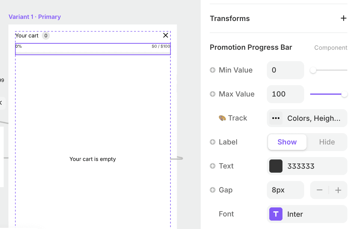 The Promotion Progress Bar component helps customers see exactly how close they are to unlocking a promotion - whether that’s free shipping, a discount tier, or a minimum spend.