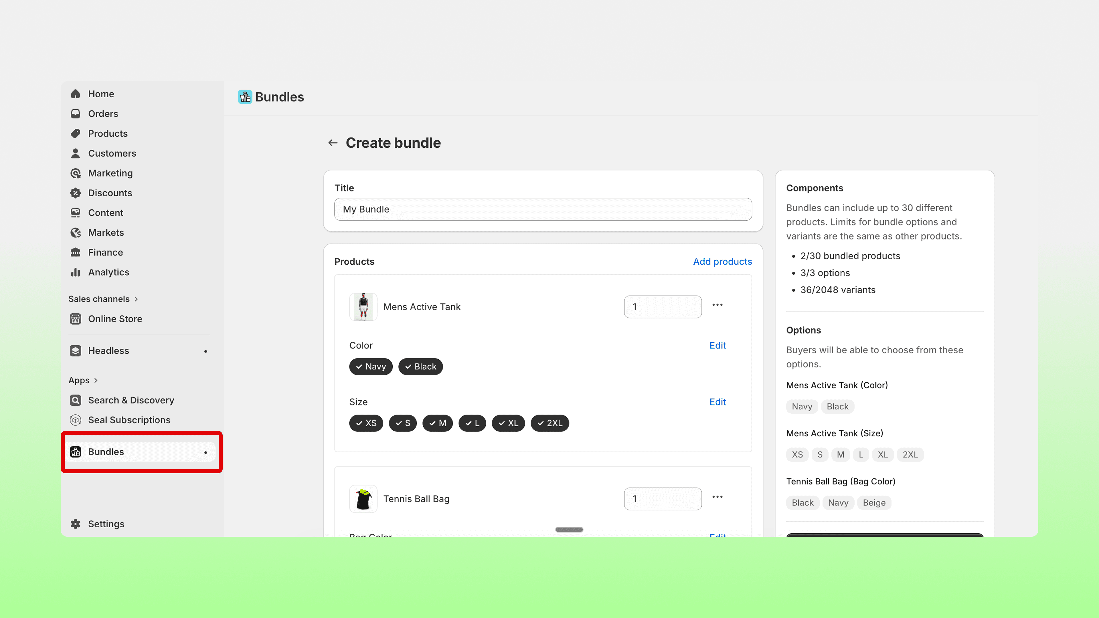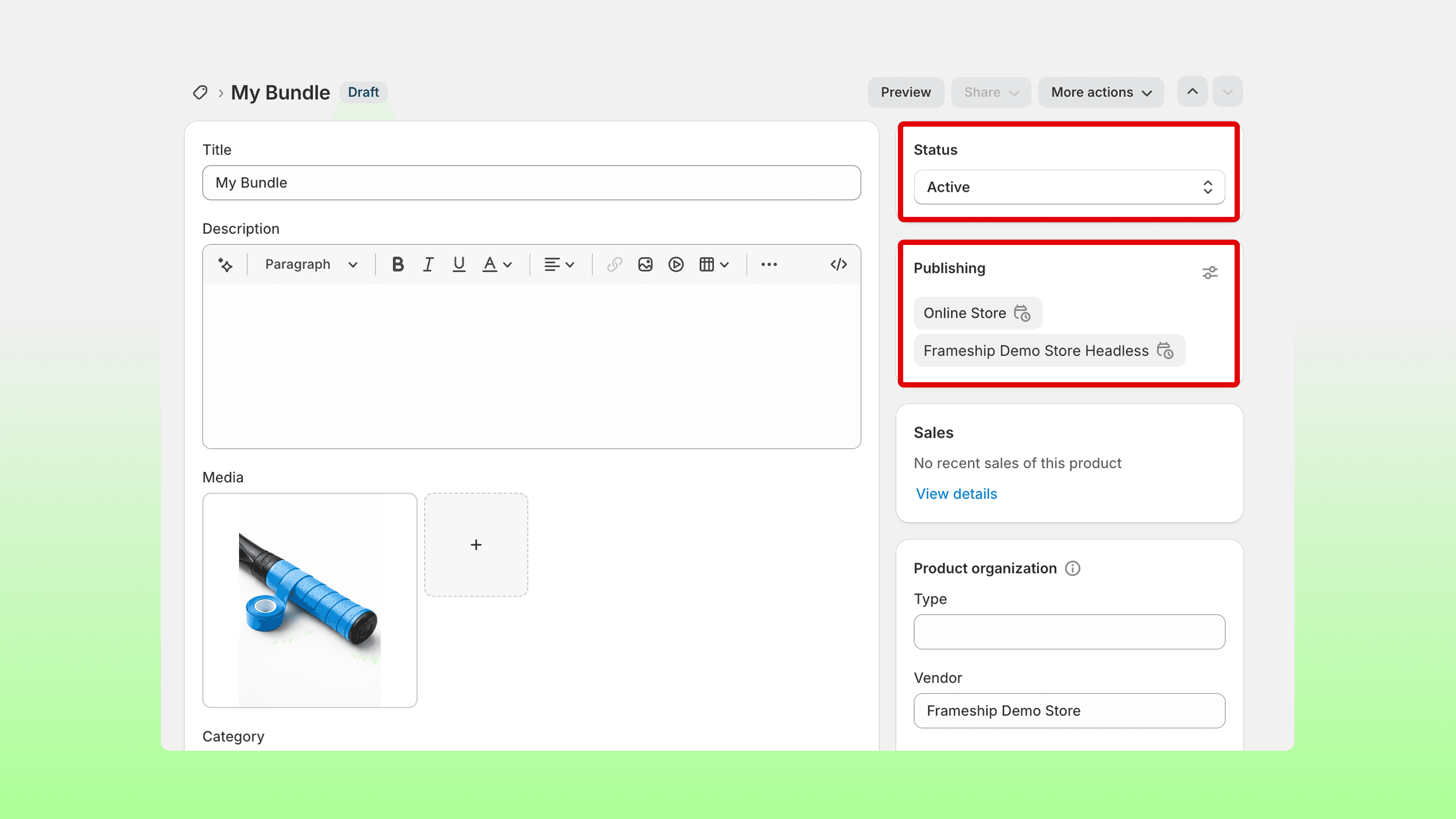 💡 Note: It is important to make sure that your bundle setting is set to Active, not draft, and also that your publishing is set to Online Store as well as your Headless app, otherwise this will not sync through to Framer.