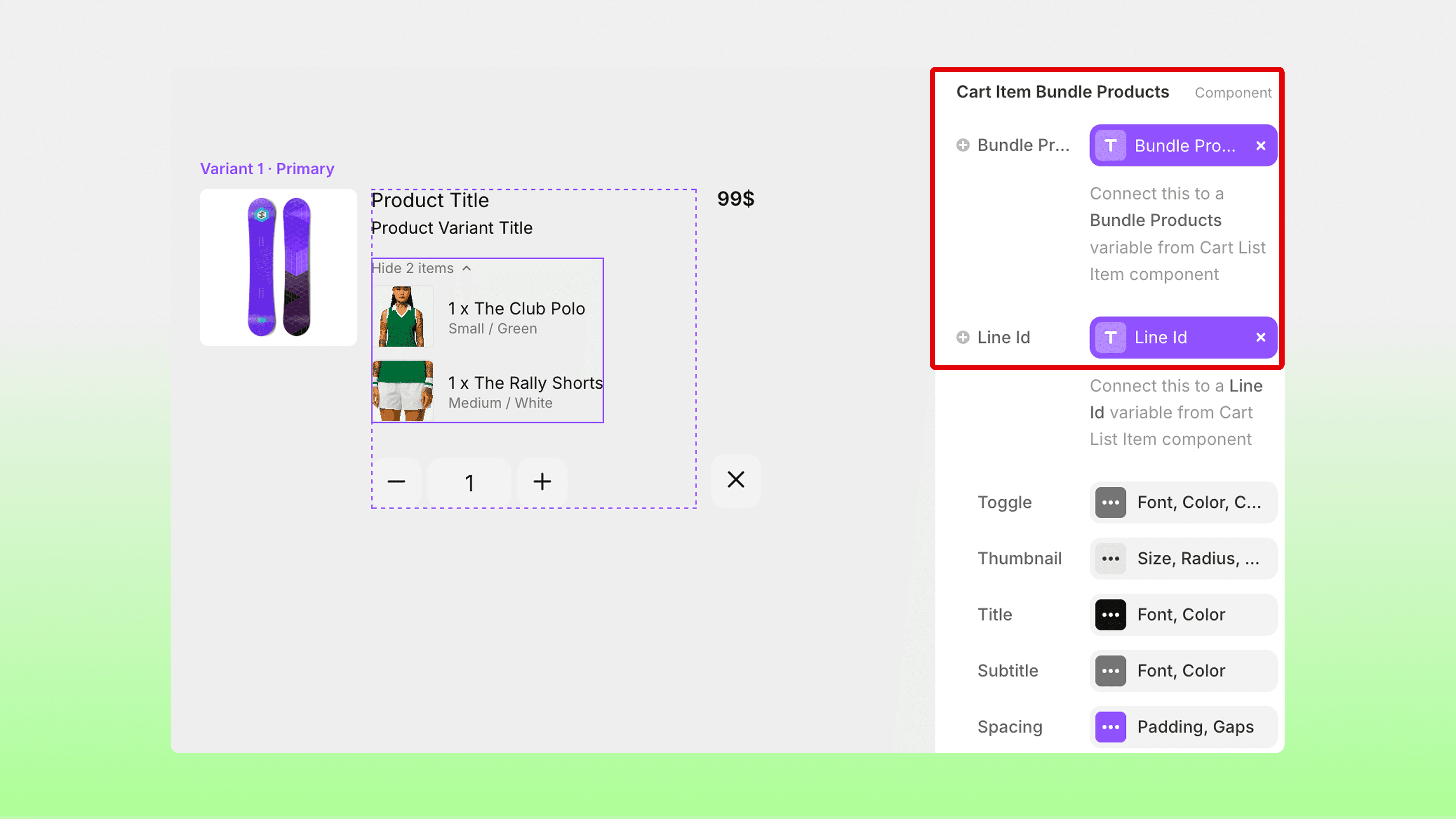 Connect the Bundle Products data and Line id data in the Properties panel.