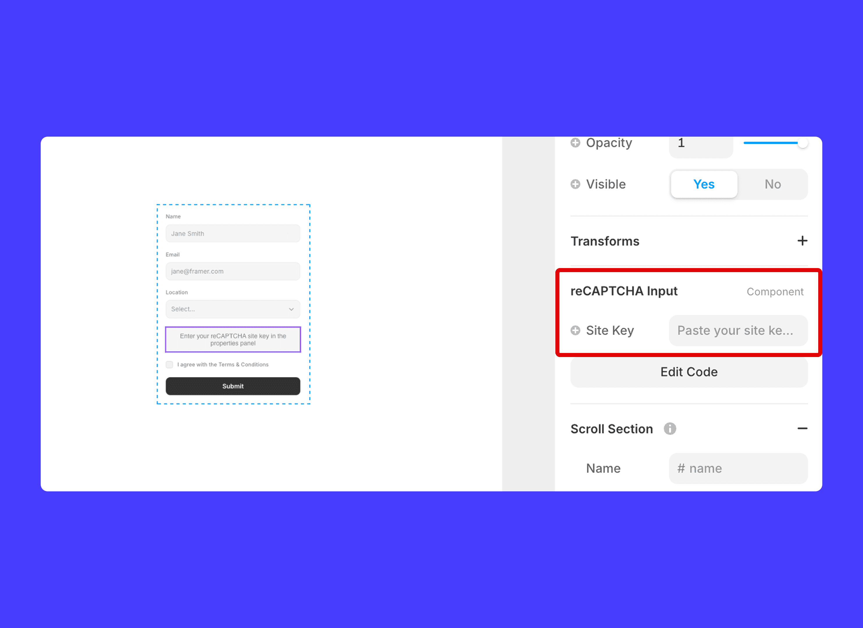 Paste the Site Key into Framer