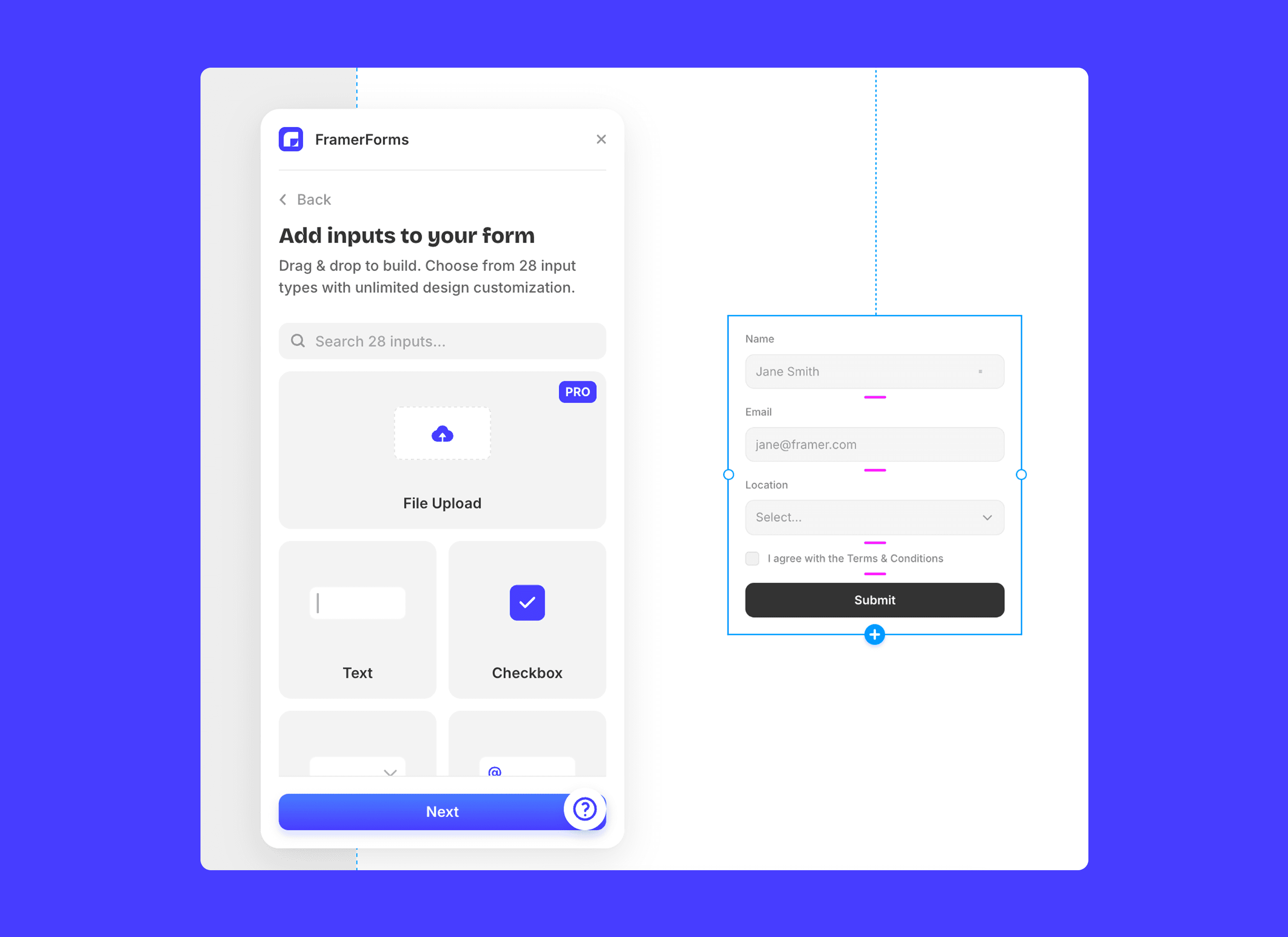 Add any form inputs you wish into your form by simply clicking on any options. These will be added automatically to the canvas. Drag these into the form page layers to insert them.