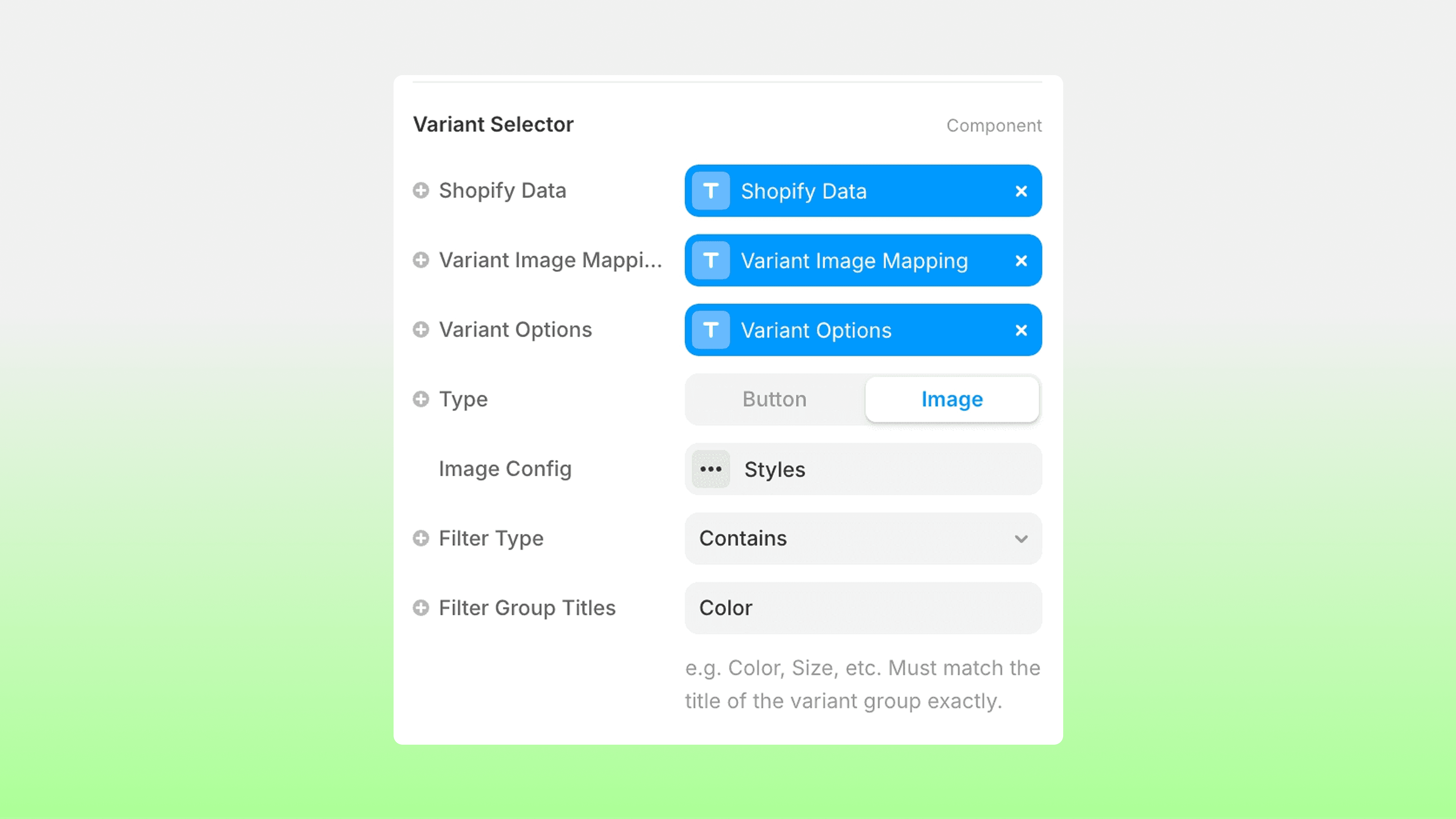 Connect ‘Shopify Data’, ‘Variant Image Mapping’ and ‘Variant Options’ variables to the matching field from the CMS.
