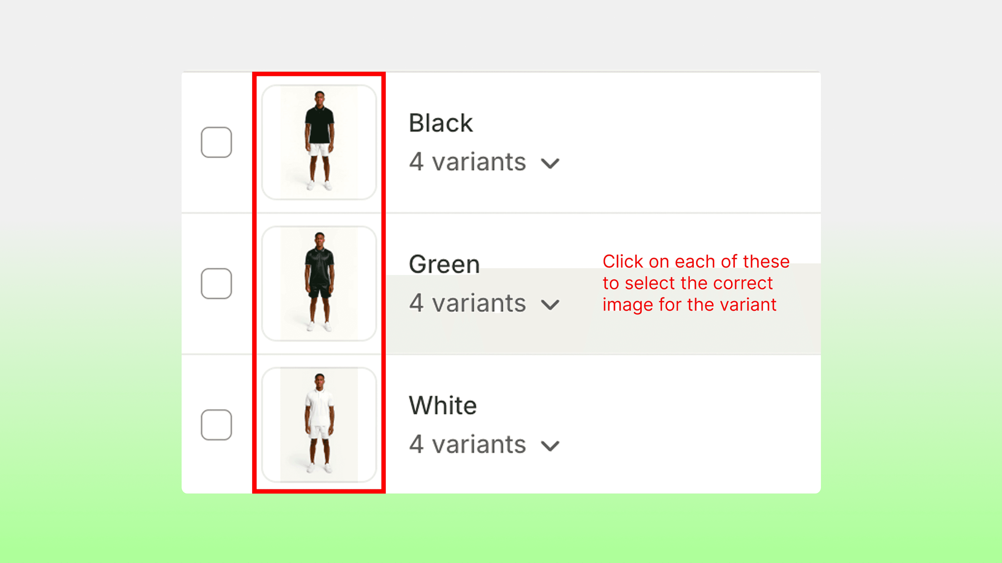 In your Shopify product details, ensure your image order matches your variant order exactly, as well as connecting each one by clicking the box next to each variant and selecting the correct image.